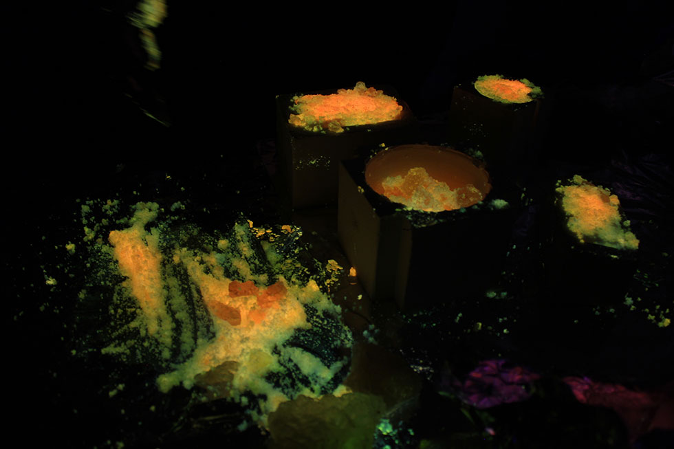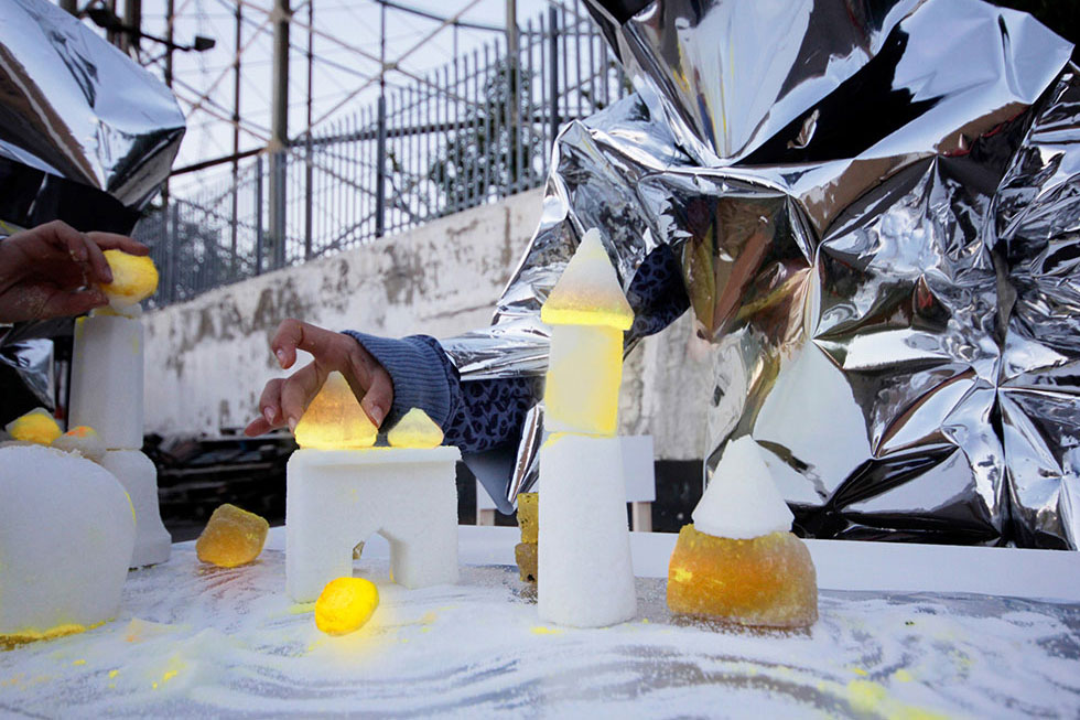 Exploring the mysterious characters of Radiant Crystals gives us the opportunity to investigate and experiment with future energy needs. The glowing sugar crystal bricks invite us to link back into utopian rocket trains, extraterrestrial journeys, skyscrapers. Whilst playfully being involved in this radiant materiality, we could imagine ourselves as martian engineers working on energy grids, transportation networks and information systems to come up with a new crystal palace for the human.