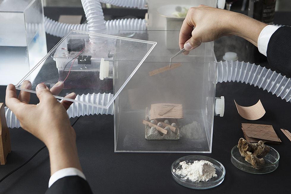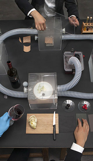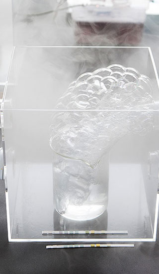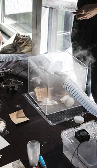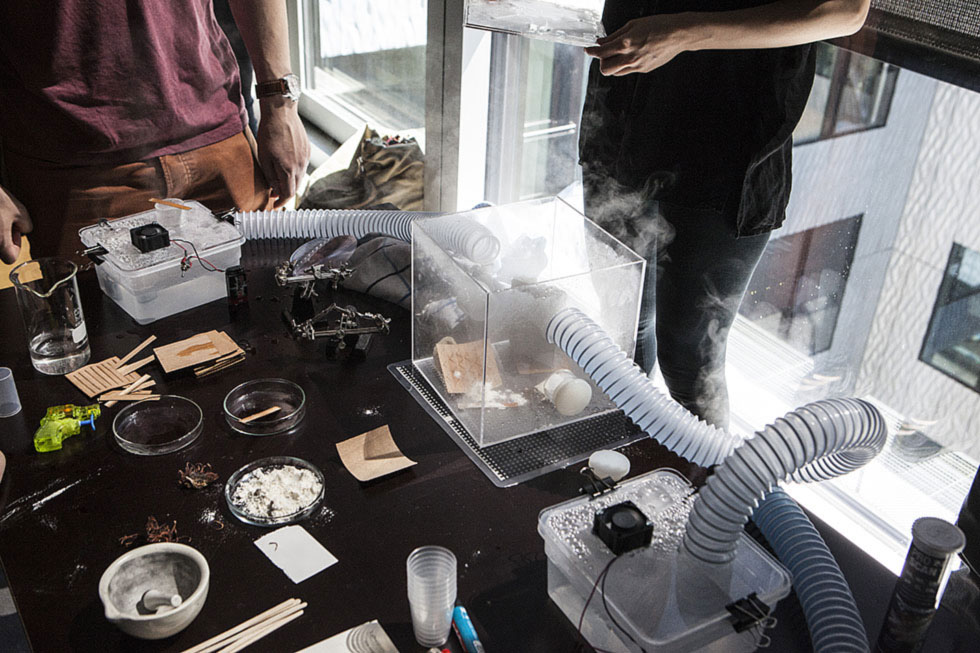 While diving into different scales, vapor becomes a coating agent on receptive micro-surface structures, a carrier for various flavors and nutritions in molecular kitchen, conditioning social bubbles, or affect air conditions in the workshop space itself. The gaseous material as a mediator has been built up imposing its own rules while being designed to study processes, that might happen with us all time.