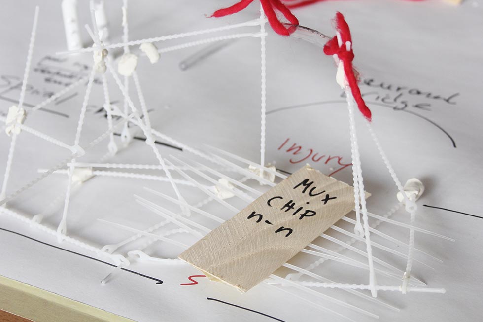 The technical perspective of the project is the advancement of a nerve-to-electrode connection system based on a 3D micro-electrode array (MEA) sensor. Our focus is to observe and understand a designers role in research processes and interdisciplinary teams through practice. This role includes structural tasks such as project planning, mediation within the team, dialogue with external experts, organisation of workshops as well as communication to the public. Further it means the ideation of potential scenarios and the development of business ideas.