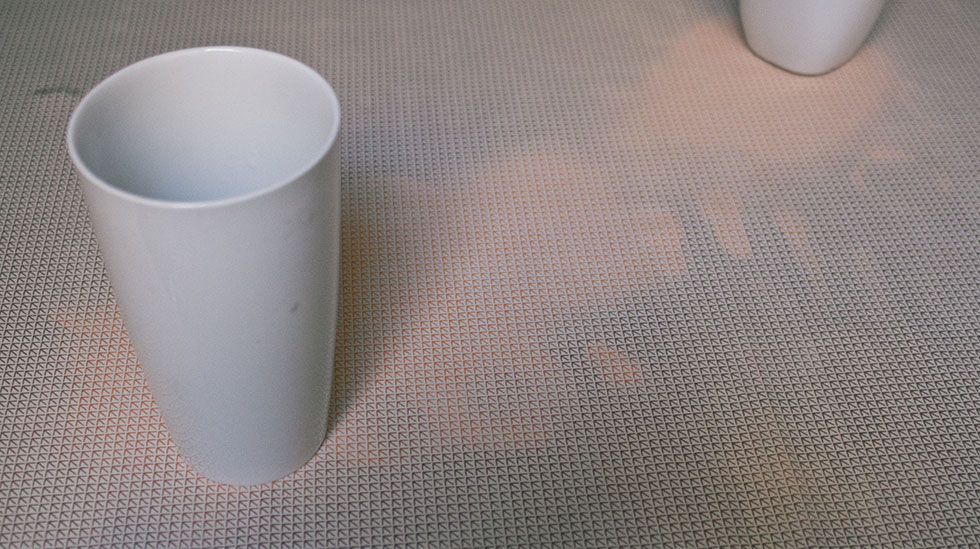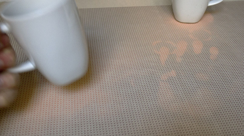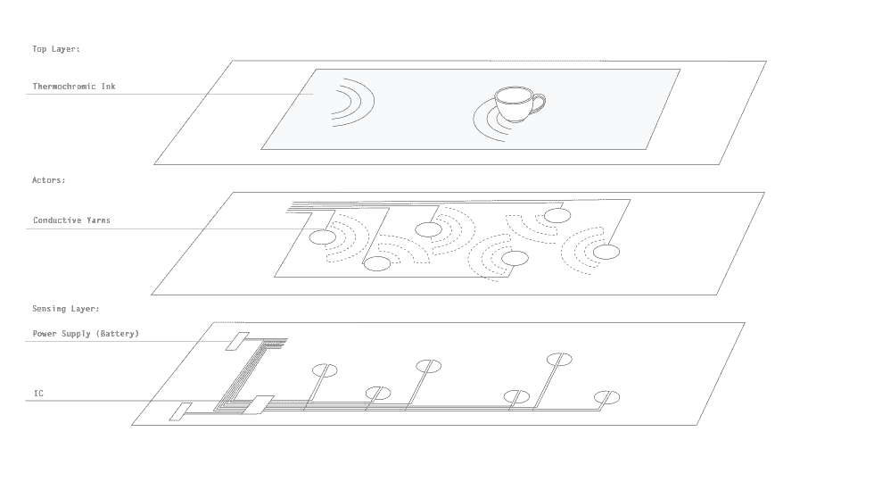 The "Interactive Tablecloth" captures traces of objects, like cups or hands on its surface through thermal reactive pigments screen printed on top. The surface reacts on 35°C with a color change, also triggered by heated resistant yarns and pressure sensors on the bottom layers of the tablecloth. A microcontroller can track the sensed inputs to play it back either linear or nonlinear over time.