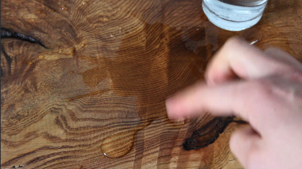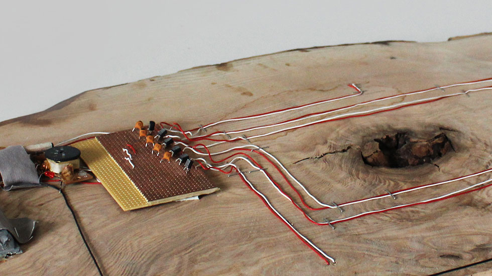 The Waterradio is a wooden board reacting to water by running different radio stations to listen to. The wood is extended through thin electrical wires in its annual rings, so that different spilled traces of liquids close different circuits to run a certain radio station. Further wiping connects other connecting points. Each composition of water droplets here represents a particular radio frequency until the water vanishes.