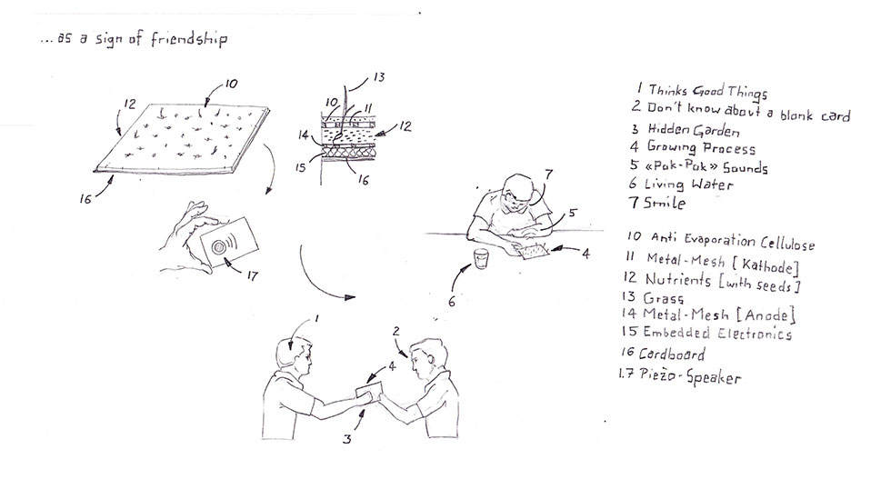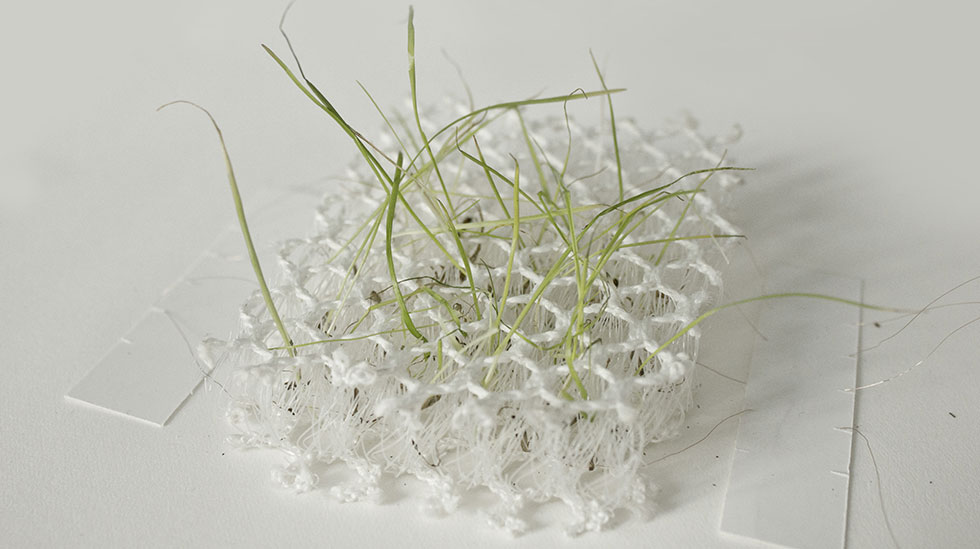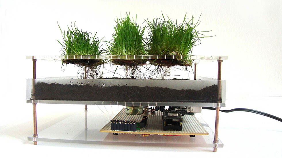 Roots, as sensitive carrier of electro-chemical signals, can give us feedback about the growth of the plant through its electrical conductivity. What if we could hear the grass growing? In a prototype, a microcontroller reads the signals running through different wires, waiting until strands of roots interconnect by growing to play back hear beat like sounds as signals of being alive.